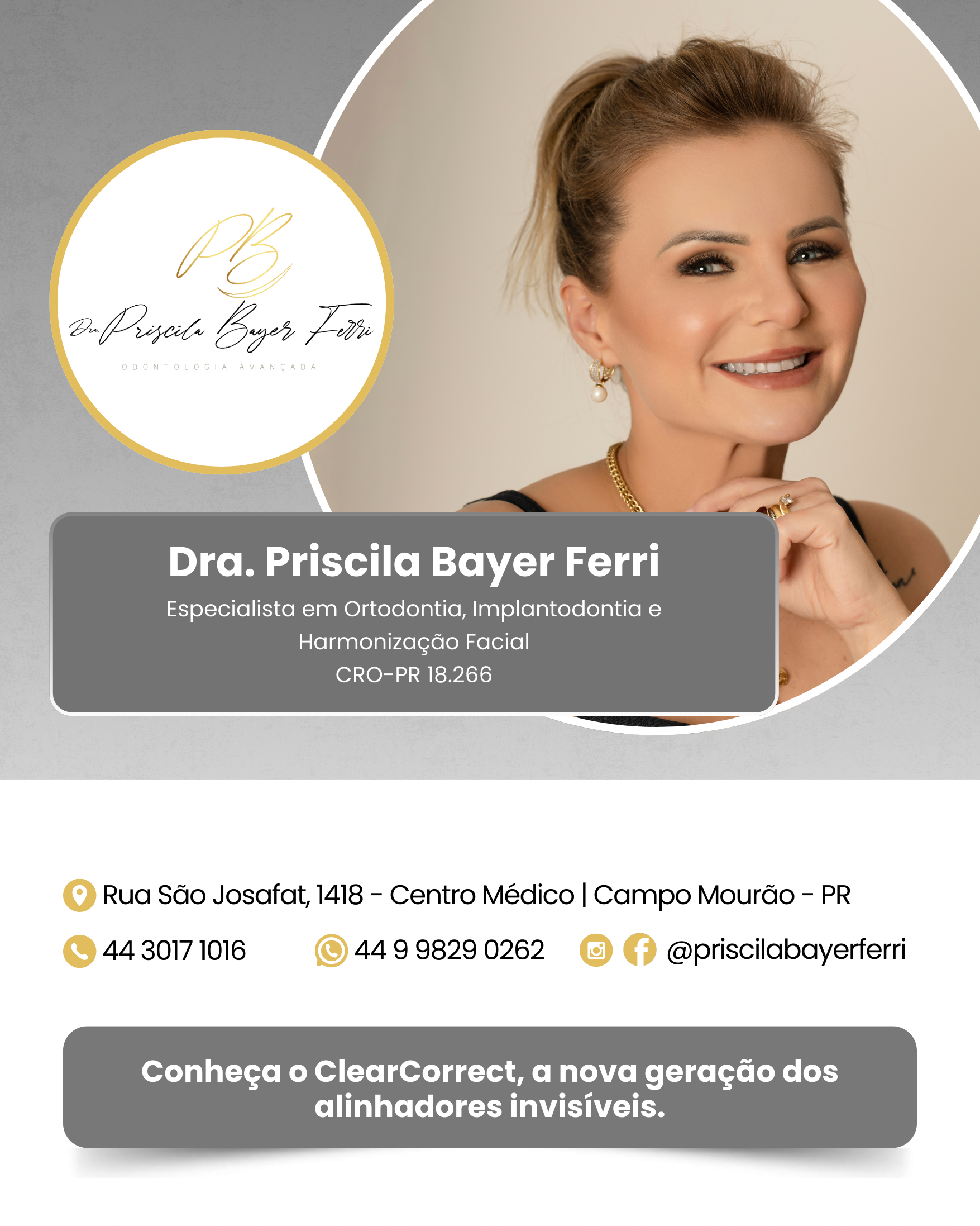 Com minha experiência, sensibilidade e o que há de mais moderno em odontologia estética, ofereço um tratamento personalizado, cuidadoso e, acima de tudo, eficaz. Cada detalhe é pensado para valorizar a sua beleza com naturalidade e segurança. Mais do que alinhar dentes, a proposta é elevar sua autoestima com leveza, saúde e confiança. Agende sua avaliação e descubra como o ClearCorrect pode transformar o seu sorriso, com maior liberdade e conforto!