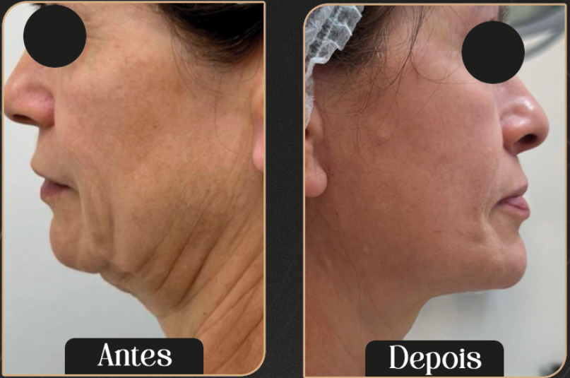 Observe a foto de antes e depois desta paciente. A imagem ilustra de forma clara a transformação do contorno do pescoço, evidenciando maior firmeza, definição e harmonia facial, após o procedimento.